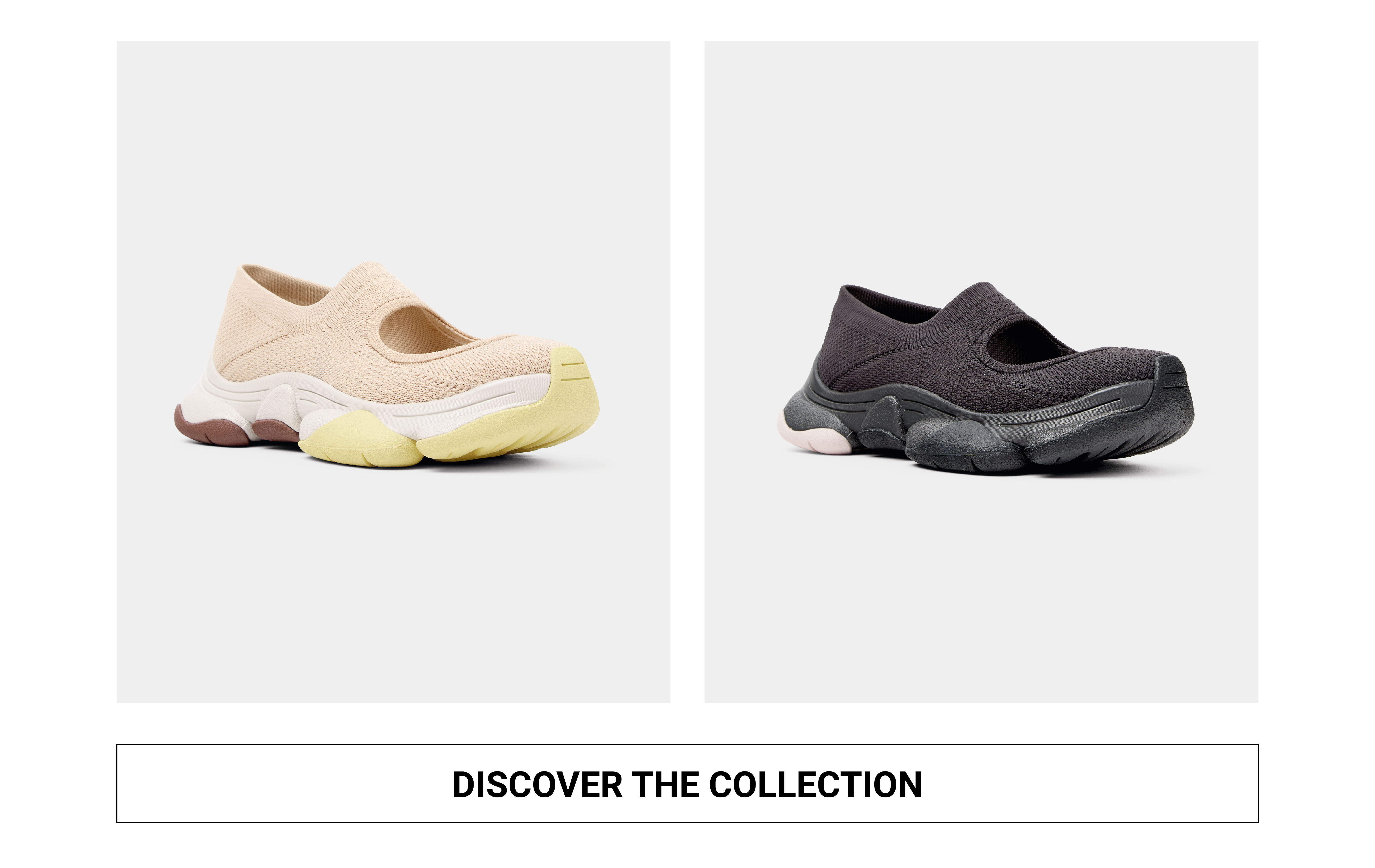 A MARY-JANE-INSPIRED STRETCH-MESH UPPER WRAPS THE FOOT IN RELAXATION, WHILE CAMPER'S SCULPTURAL KARST OUTSOLE, INSPIRED BY NATURAL ROCK FORMATIONS, ANCHORS THE SILHOUETTE.